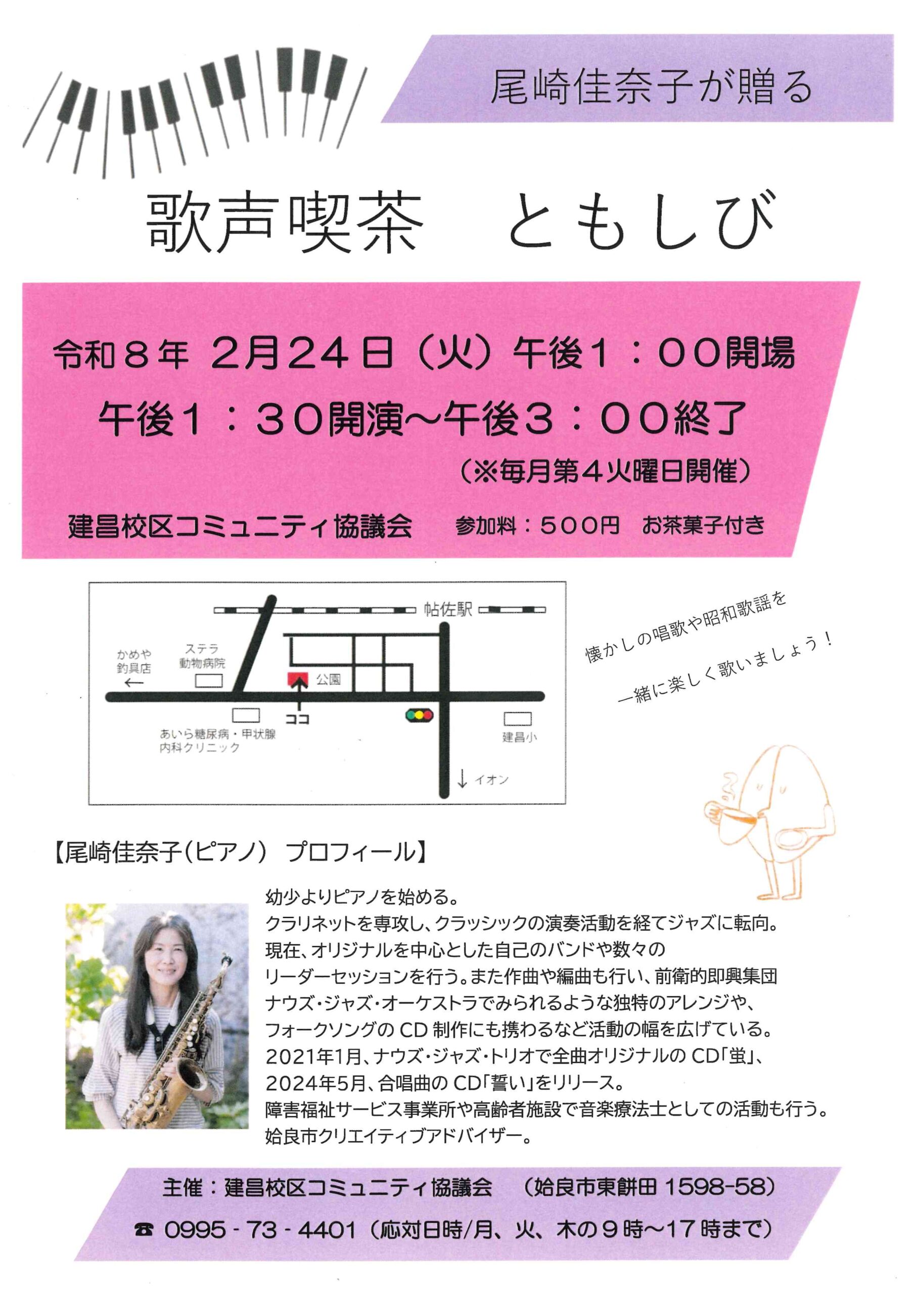 HOME イベント一覧 尾崎佳奈子が贈る 歌声喫茶 ともしび 画像をダブルクリックで拡大画像をダブルタップで拡大 × 2月 24 火 姶良 イベント名 尾崎佳奈子が贈る 歌声喫茶 ともしび 開催日 2026年02月24日(火) 開催時間 13:00開場 13:30開演~15:00終了 開催場所 建昌校区コミュニティ協議会 住所 姶良市東餅田1598-58 料金 500円(茶菓子付) 問い合わせ先 0995-73-4401 (対応日時/月・火・木の9時~17時まで) 尾崎佳奈子が贈る 歌声喫茶ともしび(※毎月第4火曜日開催) 懐かしの唱歌や昭和歌謡を一緒に楽しく歌いましょう。 校区外や自治会未加入の方など、 どなたでもどうぞ! 【主催】建昌校区コミュニティ協議会 生きイキ!マナビフェスタ 藩政時代から続く蒲生町恒例の蒲生市 記事一覧へ